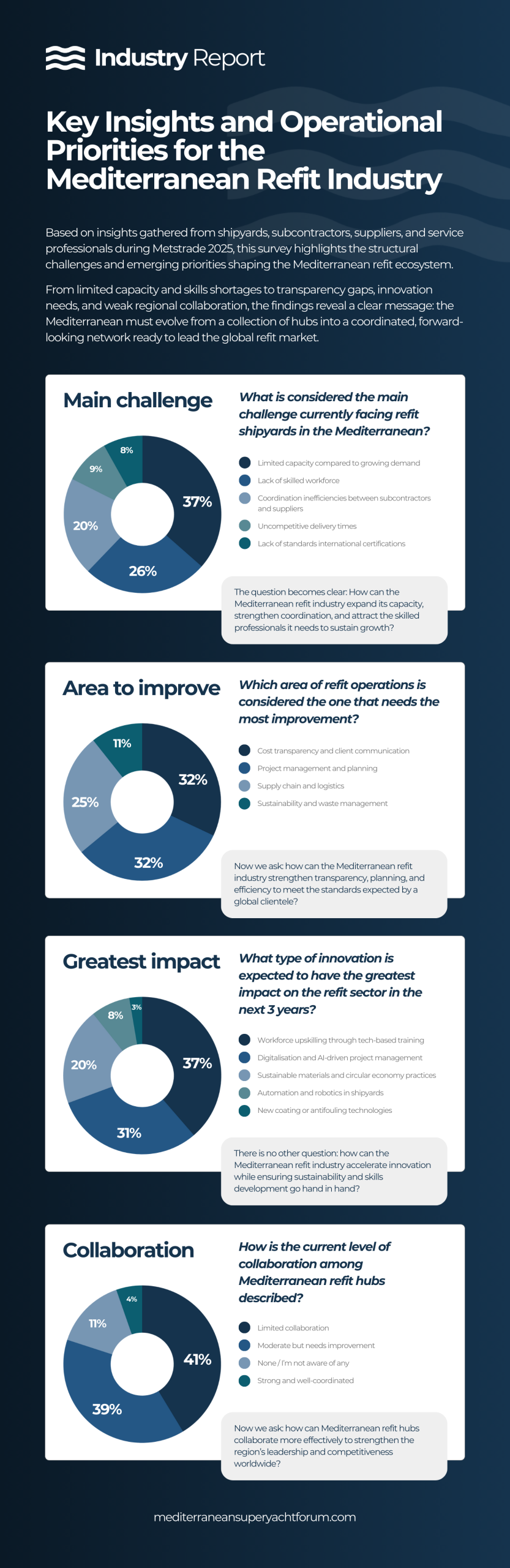 The Mediterranean Superyacht Forum Industry Survey – METSTRADE 2025 Edition gathers the perspectives of shipyards, suppliers, subcontractors, and service providers to capture the pulse of the refit ecosystem across the Mediterranean.